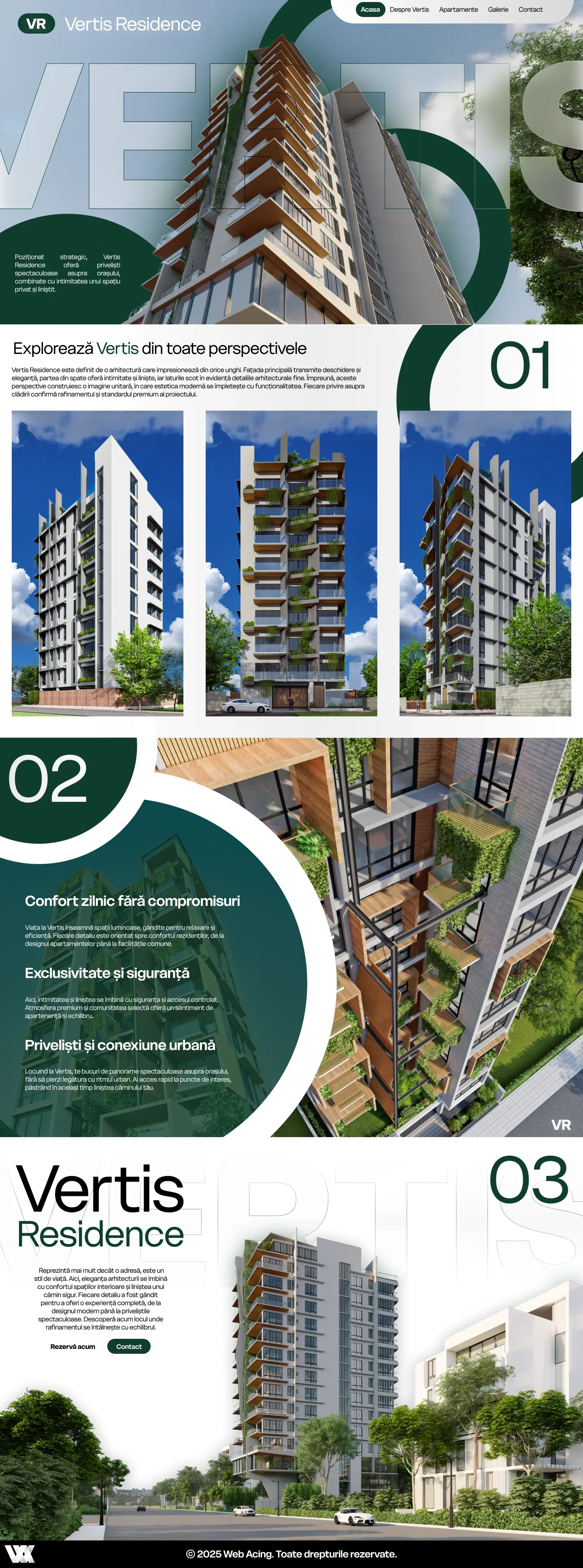 Vertis Residence este definit de o arhitectură care impresionează din orice unghi. Fațada principală transmite deschidere și eleganță, partea din spate oferă intimitate și liniște, iar laturile scot în evidență detaliile arhitecturale fine. Împreună, aceste perspective construiesc o imagine unitară, în care estetica modernă se împletește cu funcționalitatea. Fiecare privire asupra clădirii confirmă rafinamentul și standardul premium al proiectului.